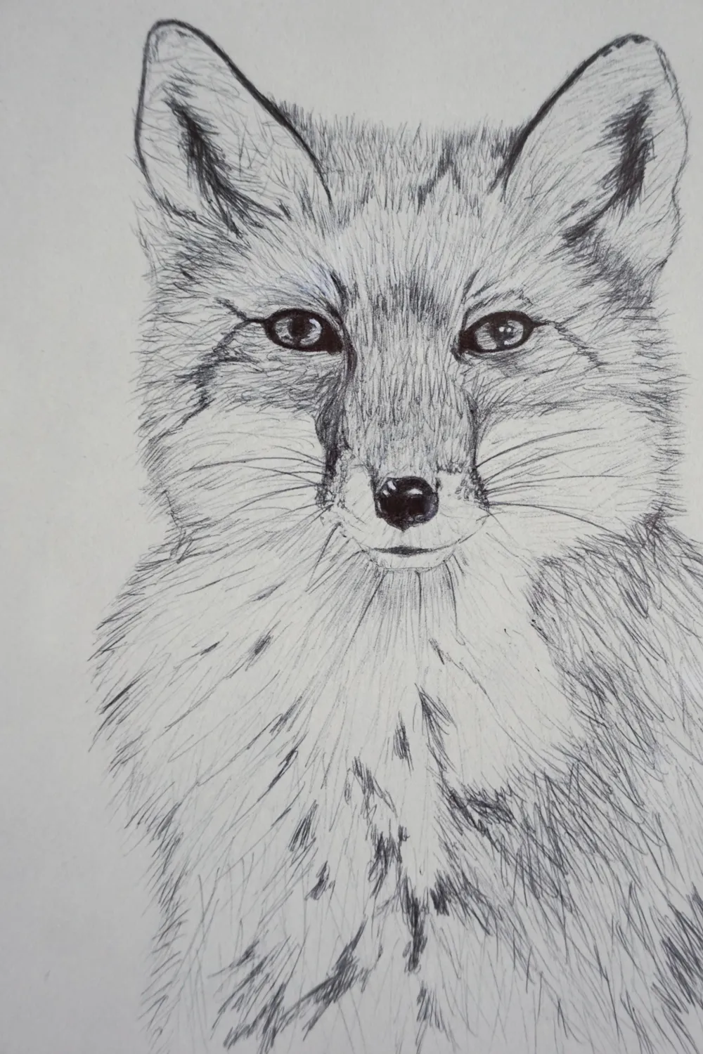 Der Fuchs schaut den Betrachter mit einem direkten Blick an, obwohl der Fuchs ein eher scheues Tier ist.