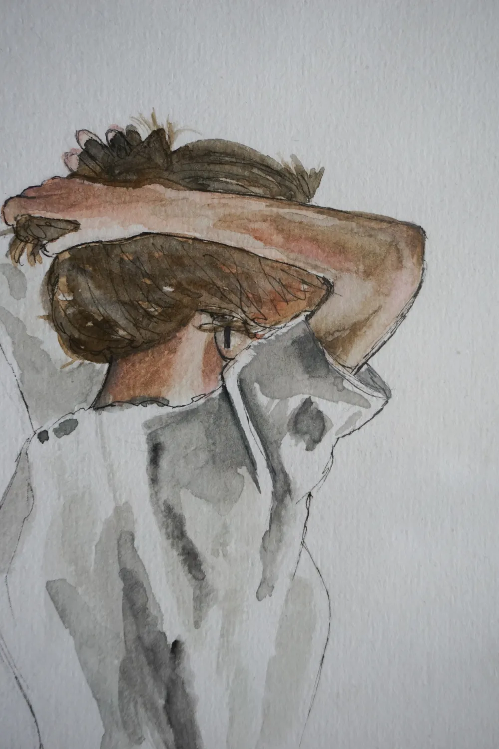 Die Frau bindet sich gerade die Haare hoch, während sie weit in die Ferne blickt.