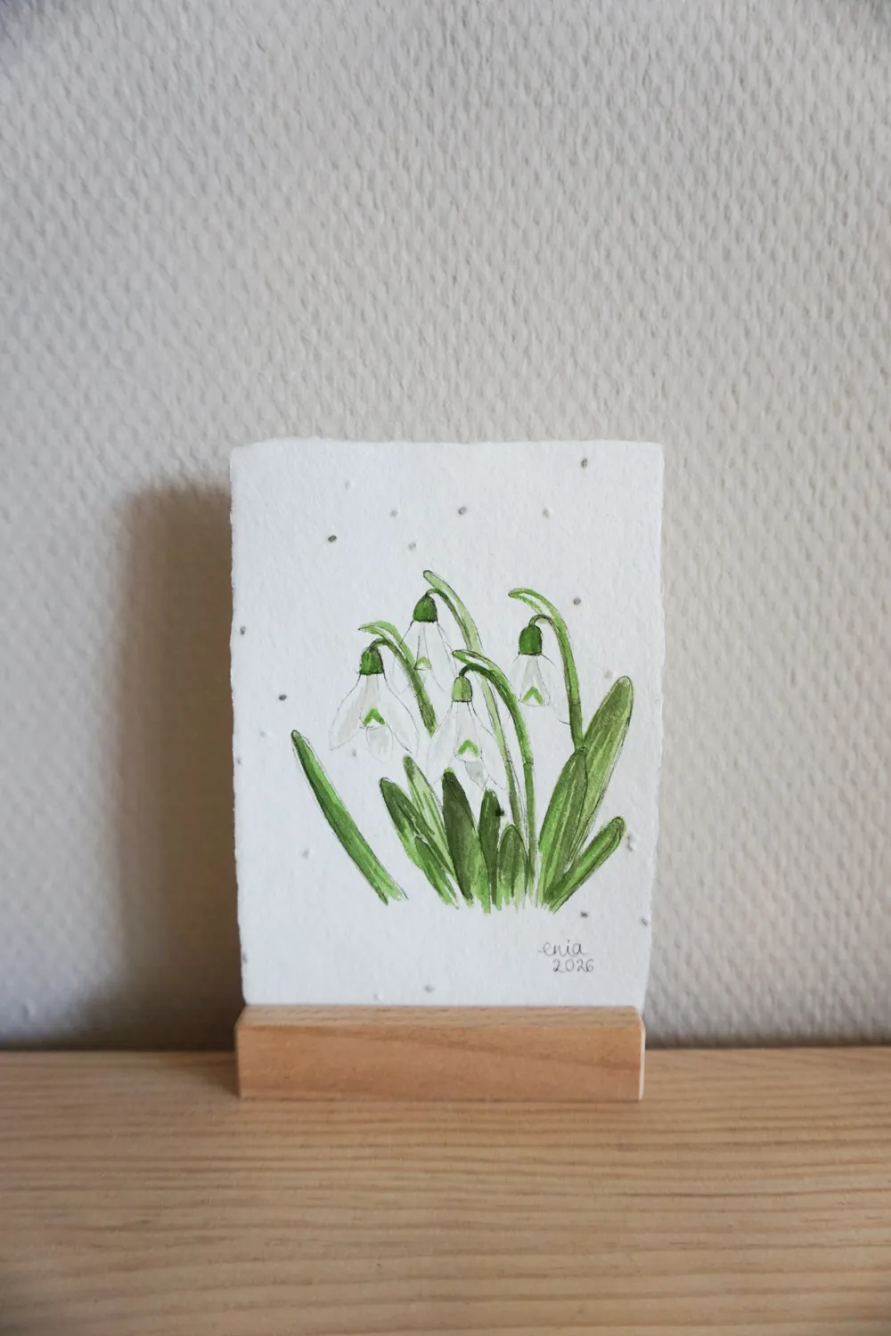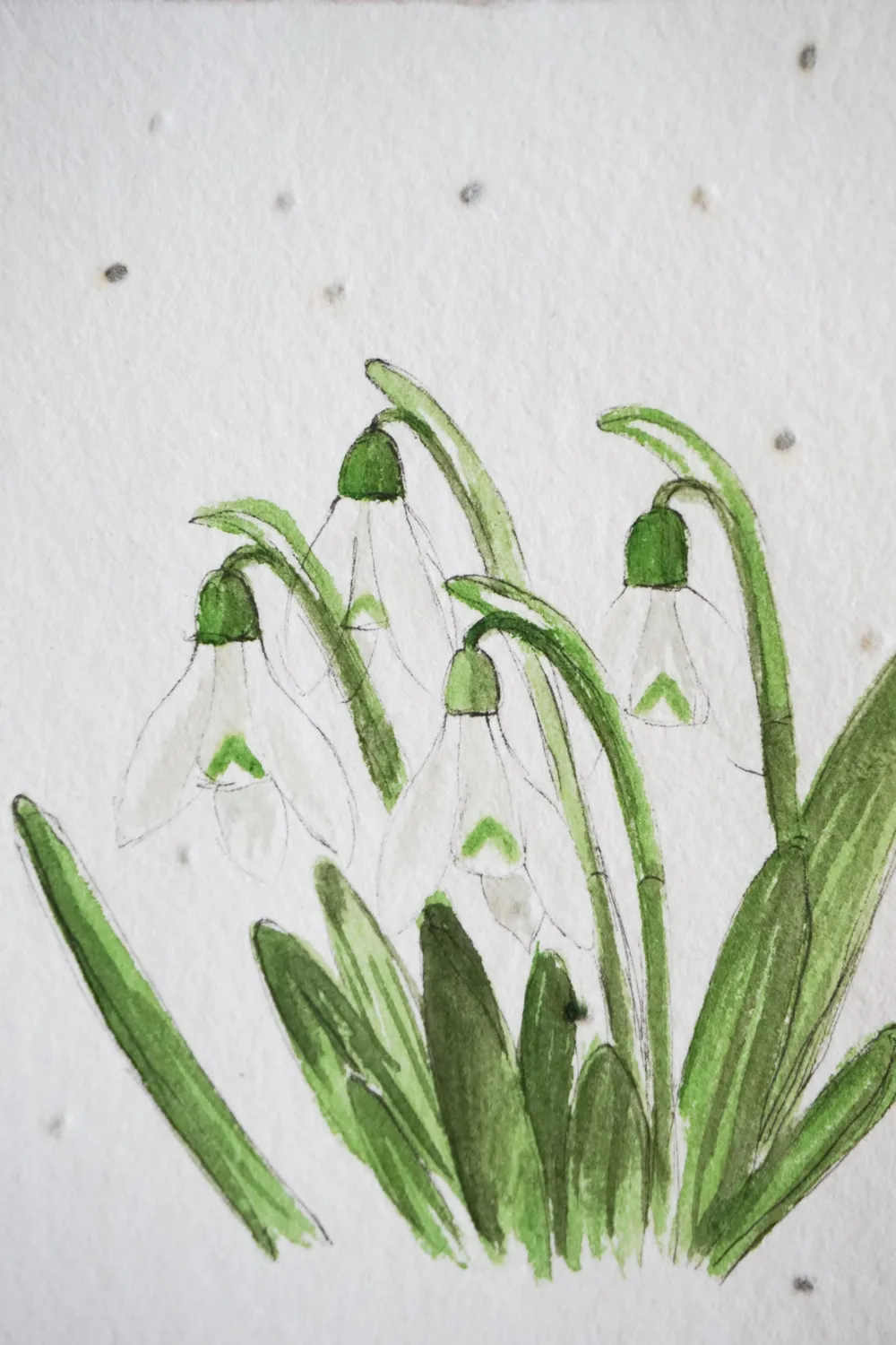 Wenn noch eine dünne Schicht Schnee auf der Wiese liegt, wachsen schon die ersten Schneeglöckchen und kündigen den Frühling an. - auf handgeschöpftem Saatenpapier (Basilikum Samen)