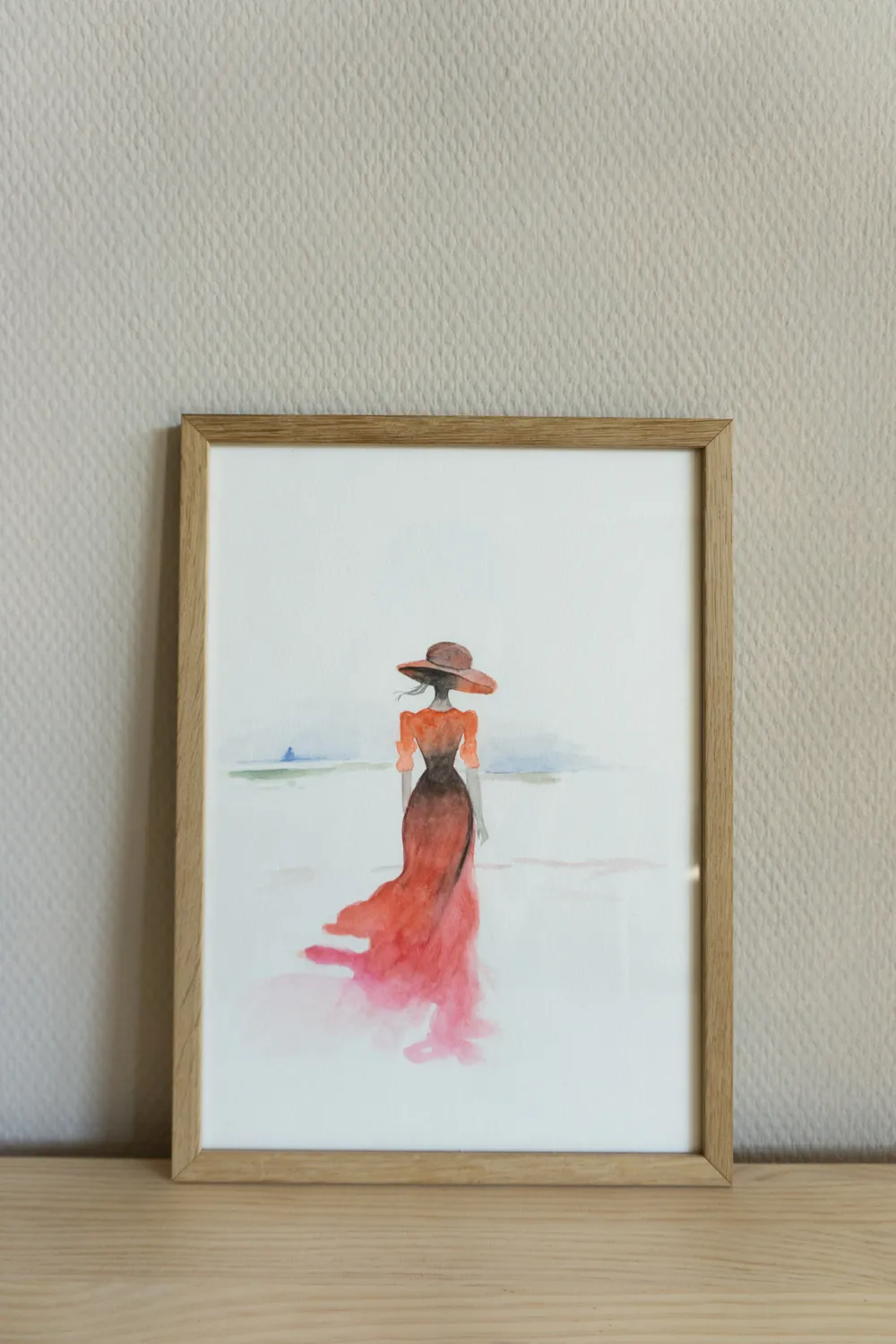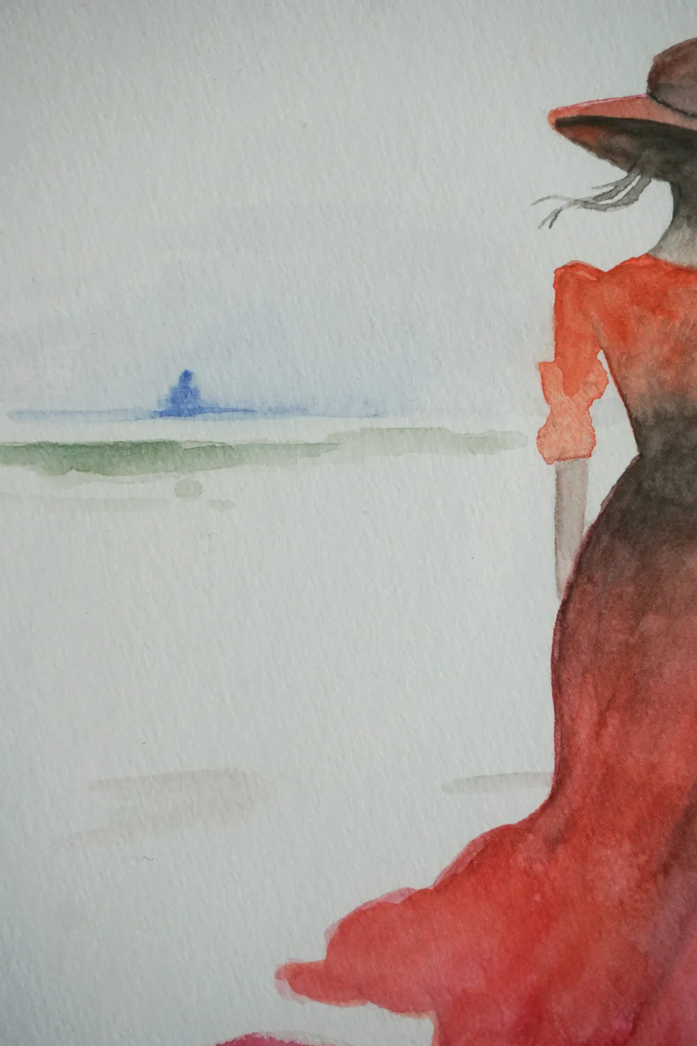 Ein kleiner Spaziergang am Meer - in der Weite ist das grüne Land zu sehen, während der Himmel in Blau erstrahlt. Der Blickfang bildet die Frau im roten langen Kleid, welches vom Wind bewegt wird.