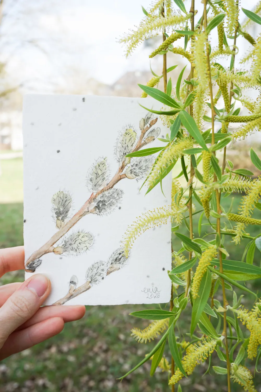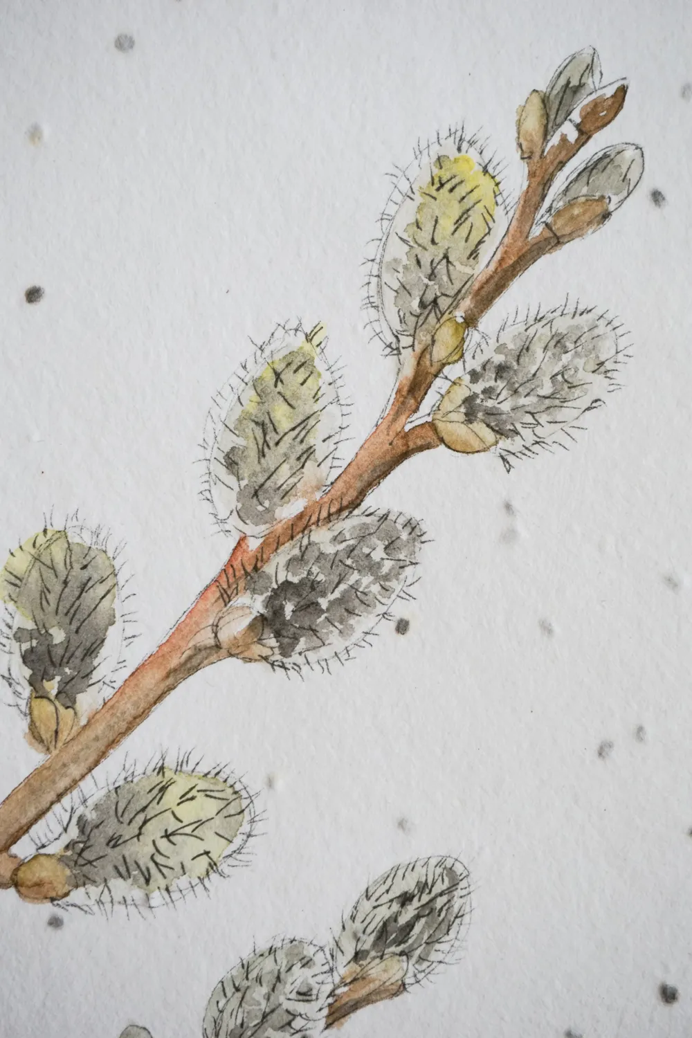 Die sanften und flauschigen Weidekätzchen verleihen dem Zweig Leichtigkeit. - auf handgeschöpftem Saatenpapier (Basilikum Samen)