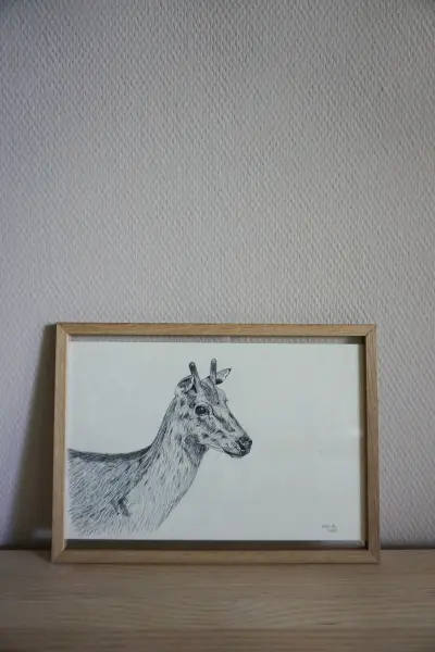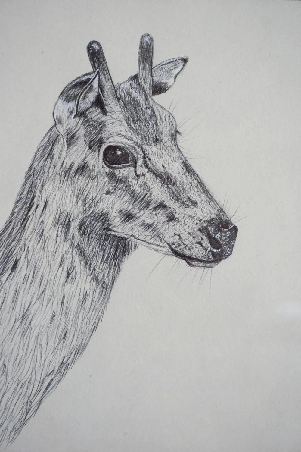 Dammhirsche sind scheue und vorsichtige Wesen. Sie sind jederzeit bereit wegzulaufen. Der Hirsch wurde mit Kugelschreiber gezeichnet.