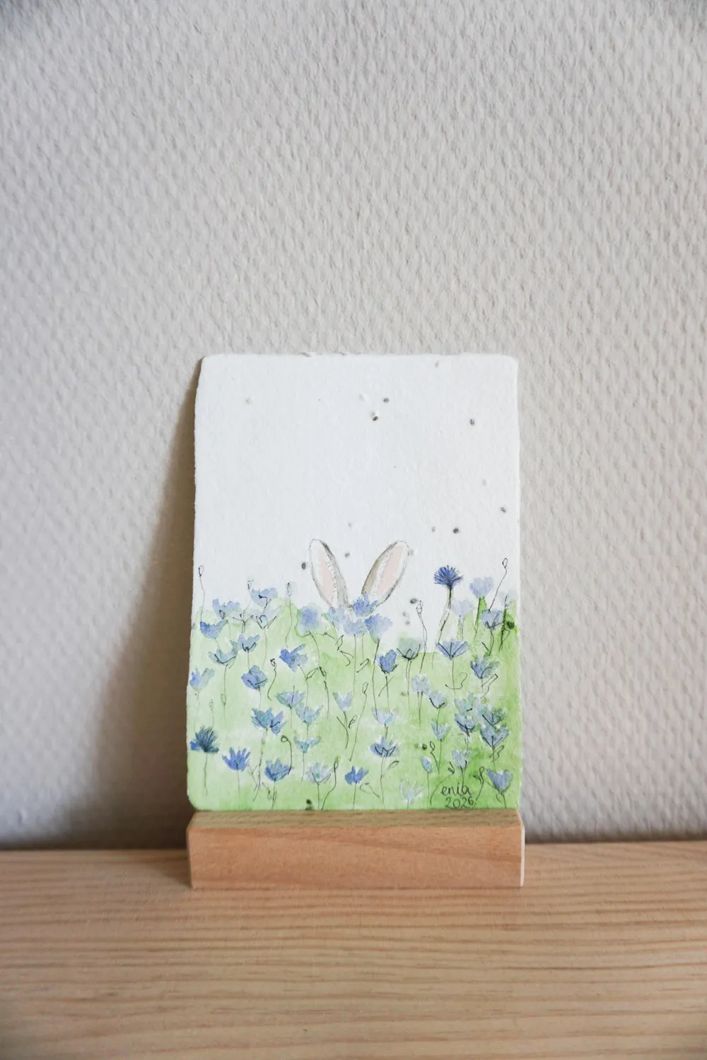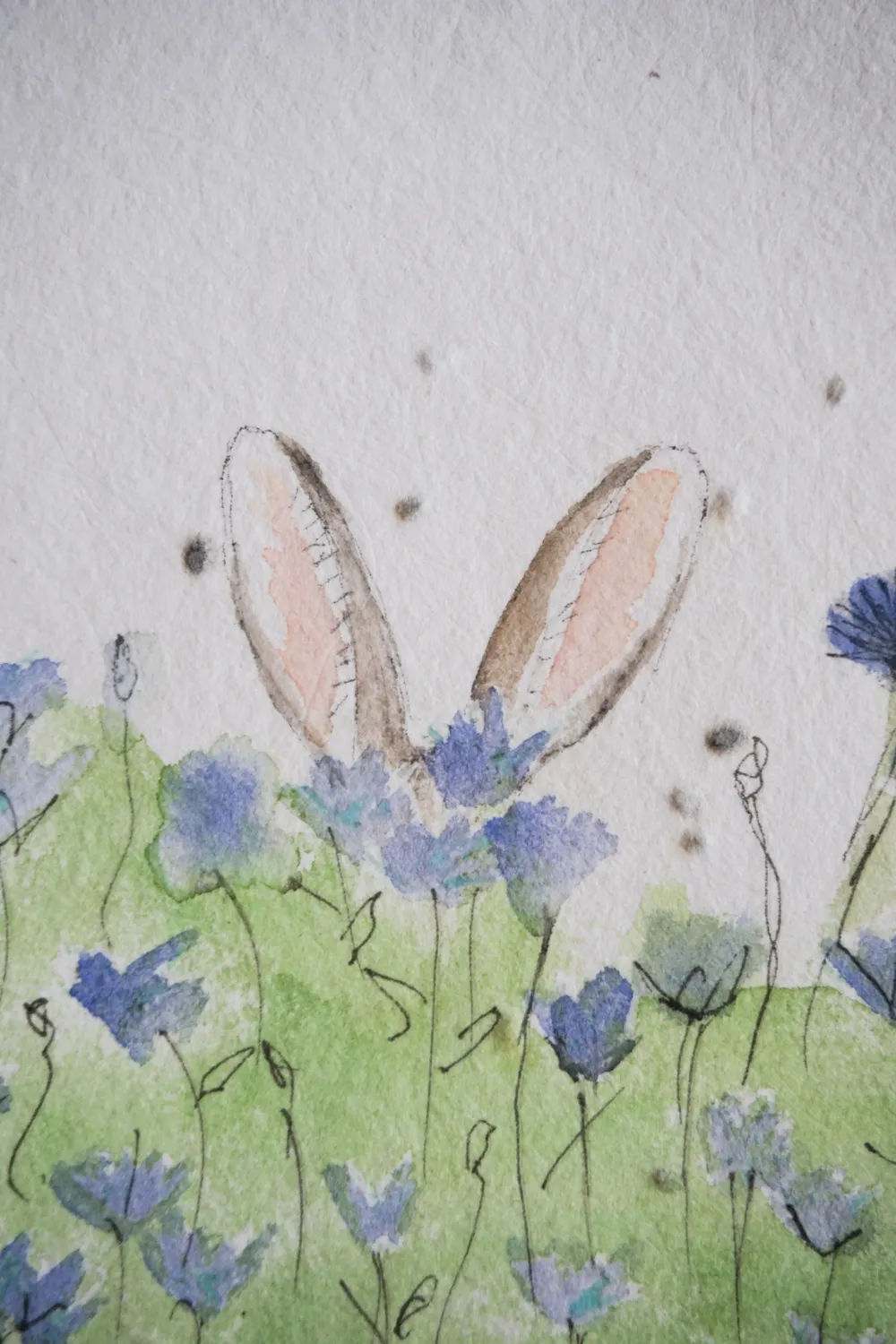 Auf der lila Blumenwiese lauscht aufmerksam ein Hase, zu sehen sind nur seine Ohren. - auf handgeschöpftem Saatenpapier (Basilikum Samen)