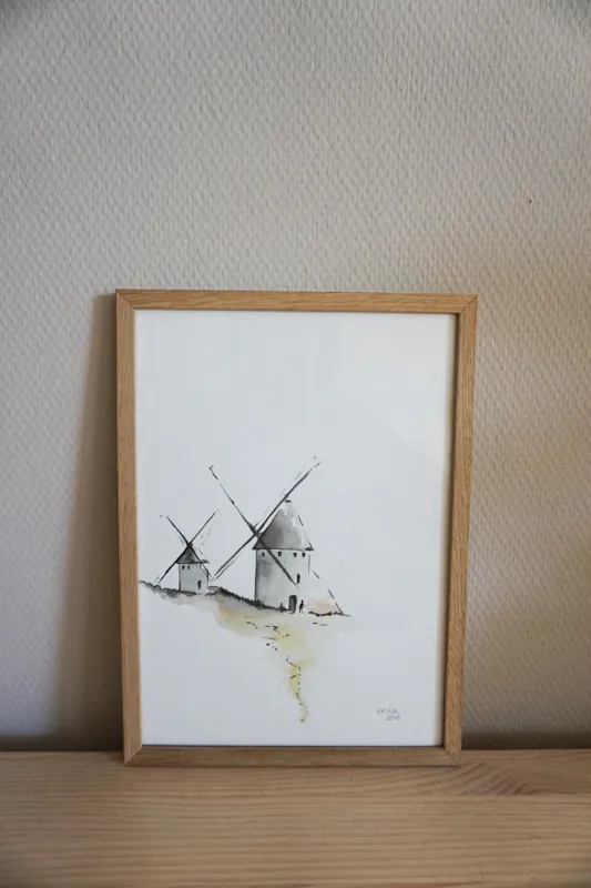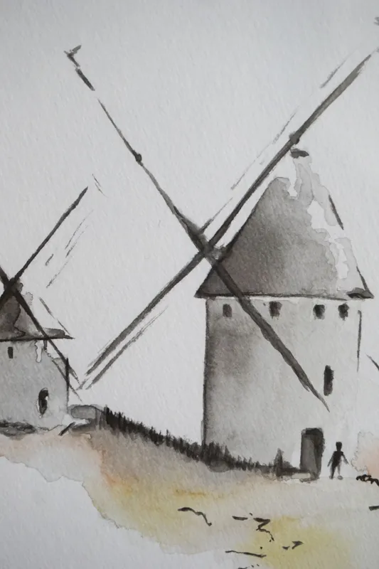 Zwei Windmühlen stehen am Feldrand - die eine etwas kleiner in der Ferne.